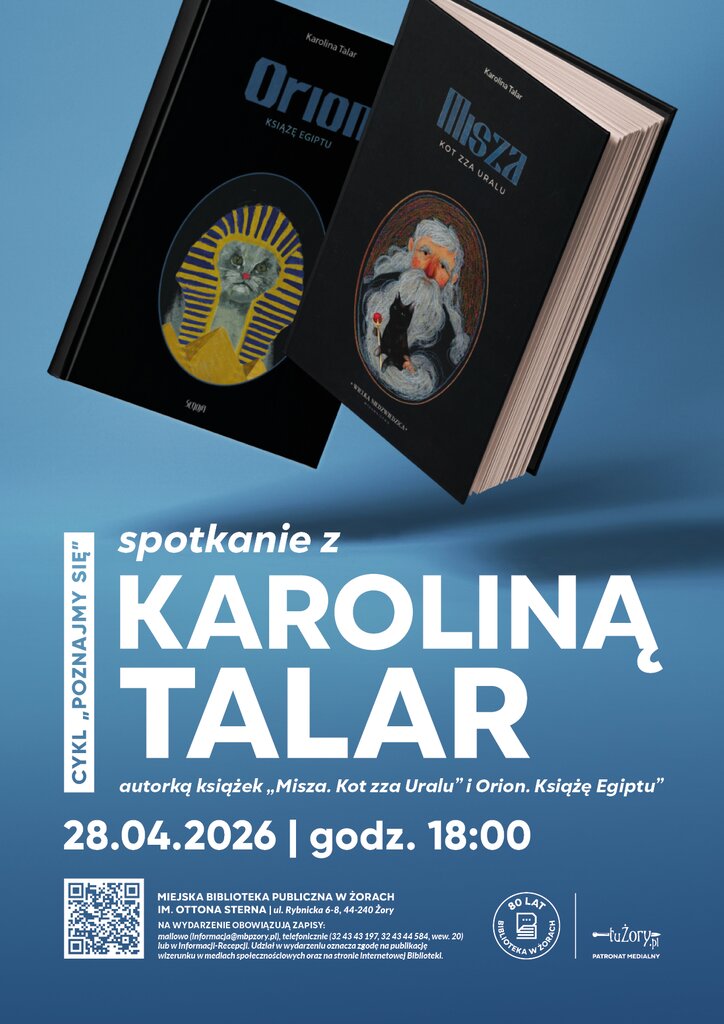 Karolina Talar urodziła się w Łodzi, ale od wczesnego dzieciństwa jest związana ze Śląskiem, a od 1989 roku mieszka w Żorach. Pisze od wielu lat, współpracowała m.in. z miesięcznikiem „Kocie Sprawy”, a w konkursie „Żorskie Opowieści” zdobyła II miejsce. Od ponad dekady prowadzi humorystyczny blog na Facebooku pod nazwą „Kociosmędek”, skierowany do dorosłych odbiorców. Autorka ma na koncie dwie powieści. W książce „Misza kot zza Uralu” pokazuje powojenną Rosję oczami kota mieszkającego z dziadkiem na prowincji. To historia z humorem, ale też z gorzką refleksją nad realiami komunizmu. Jej najnowsza powieść, „Orion książę Egiptu”, przenosi czytelników do starożytnego Egiptu. Świat obserwujemy z perspektywy kota faraona — dumnego i przekonanego o własnej wyjątkowości. To opowieść o władzy i mentalności tych, którzy ją sprawują, osadzona w czasach, gdy koty uznawano za boskie istoty. Twórczość Karoliny Talar jest kierowana do dorosłych czytelników. Łączy lekką narrację z głębszym przesłaniem. Obecnie autorka pracuje nad trzecią książką, a w wolnym czasie czyta, uczy się języka chińskiego i interesuje kulturą Chin.