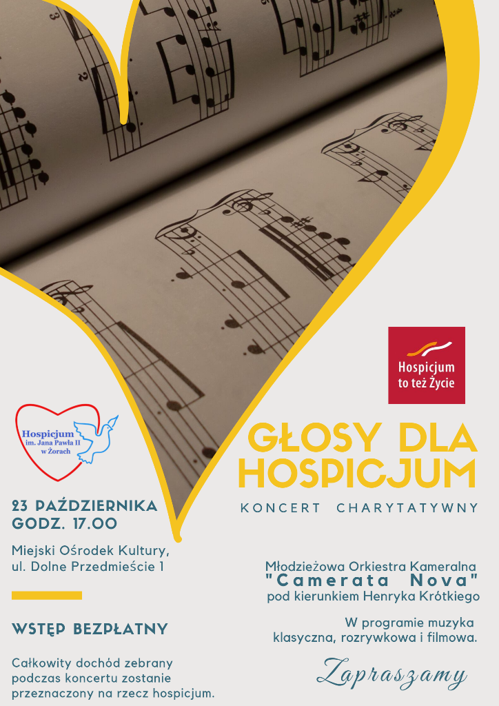Koncert odbędzie się w środę, 23 października o godz.17.00 w Miejskim Ośrodku Kultury w Żorach, przy ul. Dolne Przedmieście 1. Wstęp wolny! Całkowity dochód z imprezy – zebrany podczas koncertu do puszek kwestarskich – przeznaczony zostanie na rzecz żorskiego Hospicjum. Osoby zainteresowane mogą odbierać darmowe wejściówki na portierni, w siedzibie Hospicjum, przy ul. Promiennej 4 w Żorach.