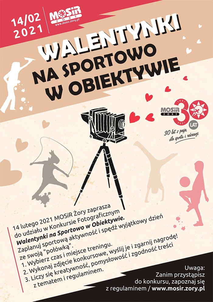 Miejski Ośrodek Sportu i Rekreacji w Żorach zaprasza 14 lutego br. do udziału w konkursie fotograficznym “Walentynki na sportowo w obiektywie”, zachęcając w ten sposób do aktywności sportowej.