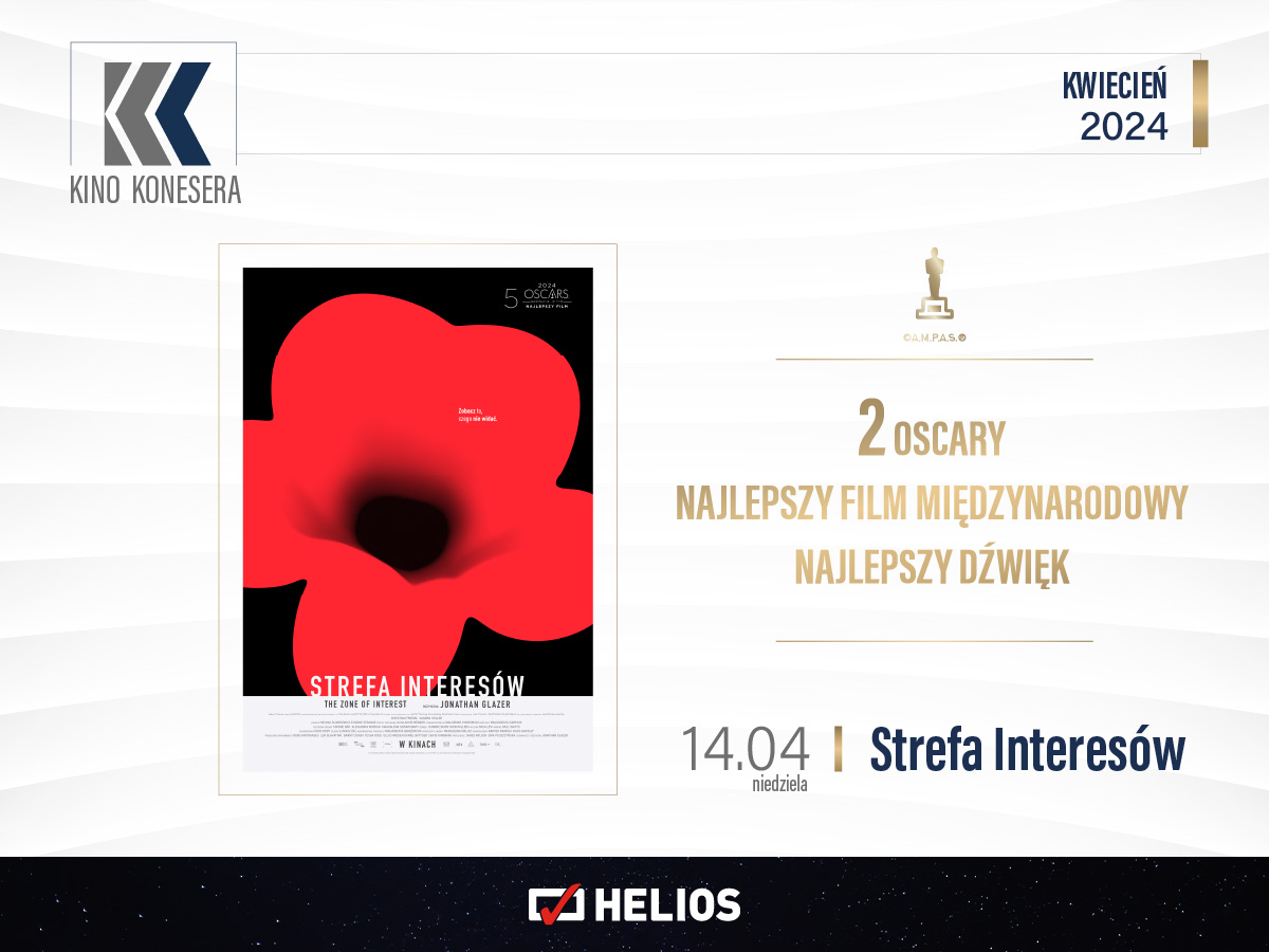 W nadchodzącym tygodniu Kino Konesera pojawi się w repertuarze aż dwukrotnie. W niedzielę, 14 kwietnia, w repertuarze zagości oscarowa odsłona cyklu. Widzowie będą mogli zapoznać się z dramatem „Strefa interesów”, nagrodzonym w kategorii najlepszy film międzynarodowy. Następnego dnia, 15 kwietnia, zostanie wyświetlony tytuł „Pamięć” – życie pracowniczki socjalnej zmienia się gwałtownie, gdy odnawia znajomość ze swym dawnym kolegą ze szkoły średniej. W filmie występują uznani aktorzy: Jessica Chastain i Peter Sarsgaard.