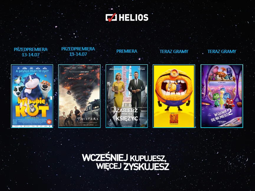 Różnorodny repertuar nieustannie zadziwia pasjonującymi pokazami. W nadchodzącym tygodniu na wielkich ekranach kin Helios pojawi się między innymi nowość – komedia romantyczna „Zabierz mnie na Księżyc” w gwiazdorskiej obsadzie. Poza tym widzowie mogą przedpremierowo zapoznać się z filmami „Był sobie kot” oraz „Twisters”, a na fanów piłki nożnej czeka transmisja finału UEFA EURO 2024!