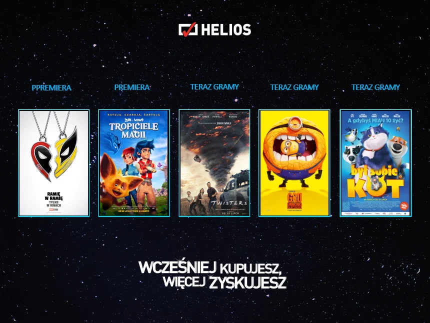 Ponadto w repertuarze kin Helios pojawią się inne emocjonujące propozycje, takie jak „Twisters” – film katastroficzny skupiający się na losach badaczy tornad. Kate Cooper na co dzień pracuje w bezpiecznym biurze w Nowym Jorku. Na prośbę przyjaciela trafia na otwarte równiny, gdzie odżywa jej trauma z przeszłości. Tyler Owens to z kolei brawurowy łowca burz, który swoje poczynania wrzuca do sieci. W obliczu śmiertelnego zagrożenia bohaterowie muszą zacząć działać razem…