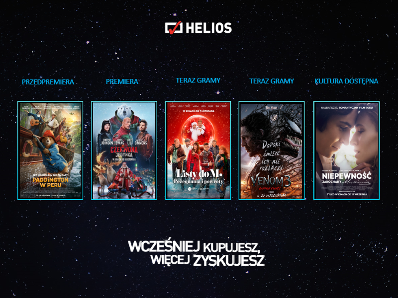 Bilety na listopadowe seanse dostępne są w kasach kin Helios, w aplikacji mobilnej oraz na stronie www.helios.pl. Dokonując zakupu wcześniej, można wybrać najlepsze miejsca, a także zaoszczędzić w ramach oferty „Wcześniej kupujesz, więcej zyskujesz”.
