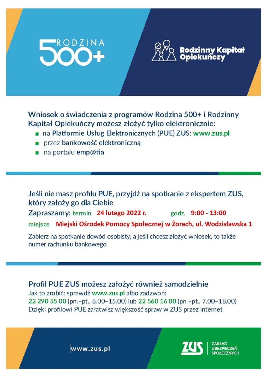 Wnioski o świadczenia z programów Rodzina 500 + i Rodzinny Kapitał Opiekuńczy można składać wyłącznie elektronicznie, poprzez Platformę Usług Elektronicznych ZUS, bankowość elektroniczną i portal emp@tia. Jeśli nie masz konta na PUE ZUS, a chciałbyś je założyć, to przyjdź na spotkanie z pracownikami Zakładu Ubezpieczeń Społecznych!