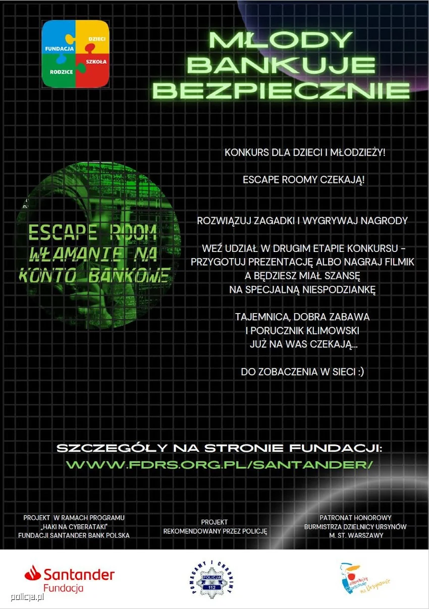 Projekt realizowany jest w ramach programu grantowego „Haki na cyberataki” Fundacji Santander Bank Polska S.A.i jest dostępny na stronie internetowej Fundacji Dzieci Rodzice Szkoła pod adresem: www.fdrs.org.pl/santander/