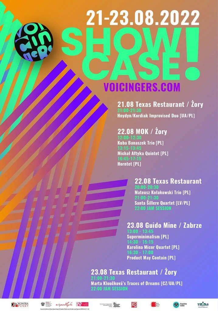 Podczas „Voicingers Showcase” zaprezentują się polskie zespoły młodego pokolenia, między innymi: Horntet, Superminimalism, Michał Aftyka Quintet, Kuba Banaszek Trio i Product May Contain. Zaprezentujemy także „Voicingers Specials”, w tym między innymi: Mateusz Kołakowski Trio, Karolina Micor Quartet, Marta Kloučková’s Traces of Dreams oraz Santa Šillere Quartet. Za scenę poszczególnych koncertów posłużą wskazane wcześniej lokalizacje w Żorach, ale także znajdująca się w Zabrzu zabytkowa Kopalnia Guido. Showcase, realizowany w dniach 21 – 23 sierpnia, organizowany jest we współpracy z Instytutem Adama Mickiewicza.