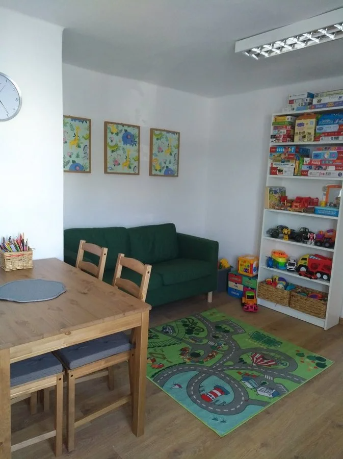 Pokój został wyposażony we wszystkie niezbędne przedmioty, a także zabawki, ponadto został dostosowany do potrzeb najmniejszych wychowanków, którzy przebywają w rodzinach zastępczych. Można w nim znaleźć między innymi przewijak dla niemowląt, dywan do zabaw, gry planszowe, klocki, puzzle, książki oraz zabawki interaktywne.