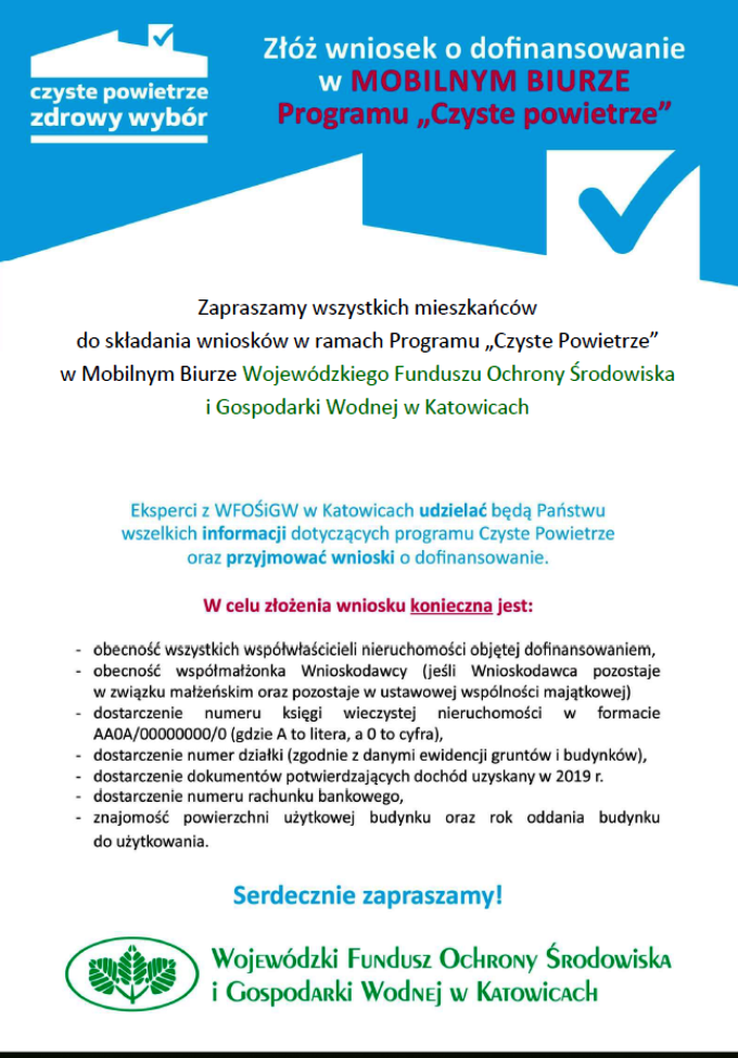 W Mobilnym Biurze eksperci z Wojewódzkiego Funduszu Ochrony Środowiska i Gospodarki Wodnej w Katowicach będą odpowiadali na pytania dotyczące termomodernizacji czy wymiany tzw. „kopciuchów” oraz co najważniejsze pomogą wypełnić wnioski o dotacje.