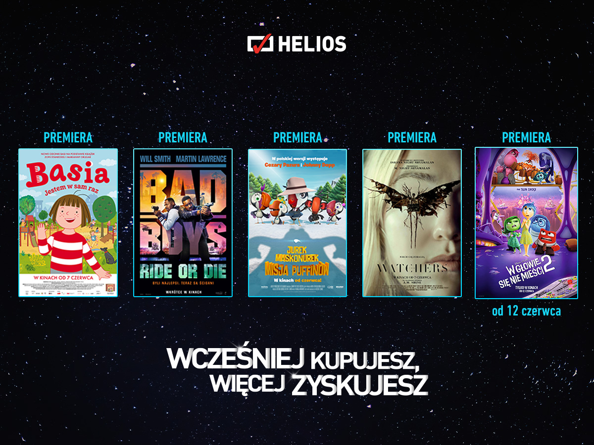 Czerwiec będzie czasem porywających nowości dla kinomanów o różnorodnych gustach. W najbliższym tygodniu w repertuarze Heliosa pojawi się aż pięć emocjonujących premier: „Bad Boys: Ride or Die”, „The Watchers”, „Basia. Jestem w sam raz”, „Jurek Maskonurek” oraz „W głowie się nie mieści 2”. Sieć kin przygotowała również wyjątkowe seanse pierwszego odcinka nowego sezonu serialu HBO Original „Ród smoka”, na które rejestrować można się już teraz! W cyklu Kultura Dostępna zaprezentowany zostanie polski kandydat do Oscara – „Chłopi”.