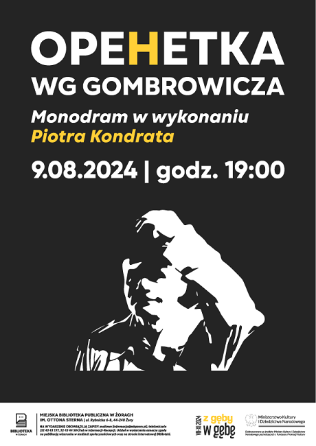 Miejska Biblioteka Publiczna zaprasza na monodram “Opehetka” wg Gombrowicza w wykonaniu Piotra Kondrata, który odbędzie się 09.08.2024 o godzinie 19:00.