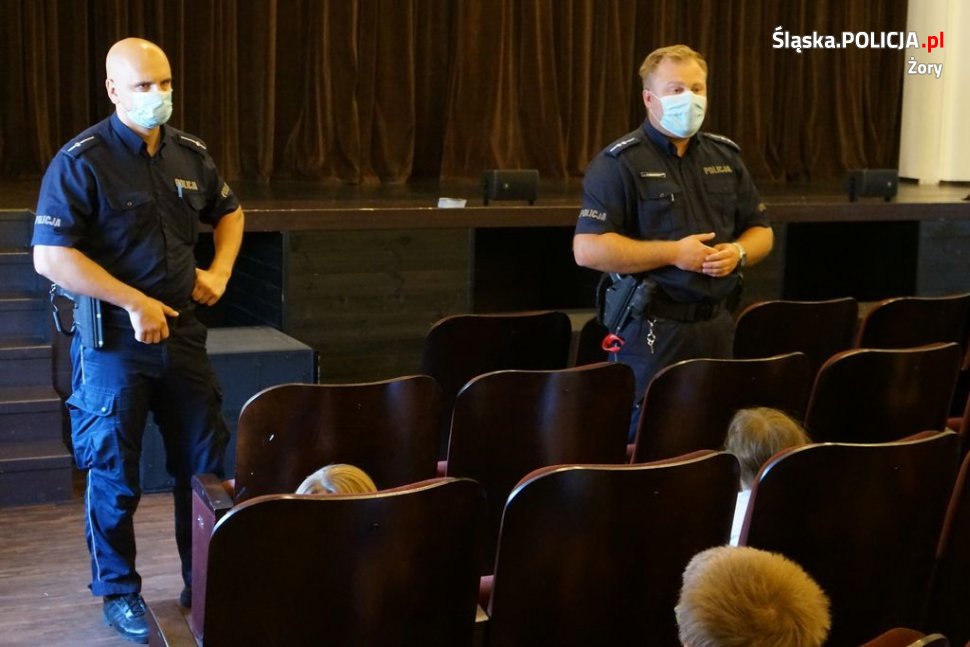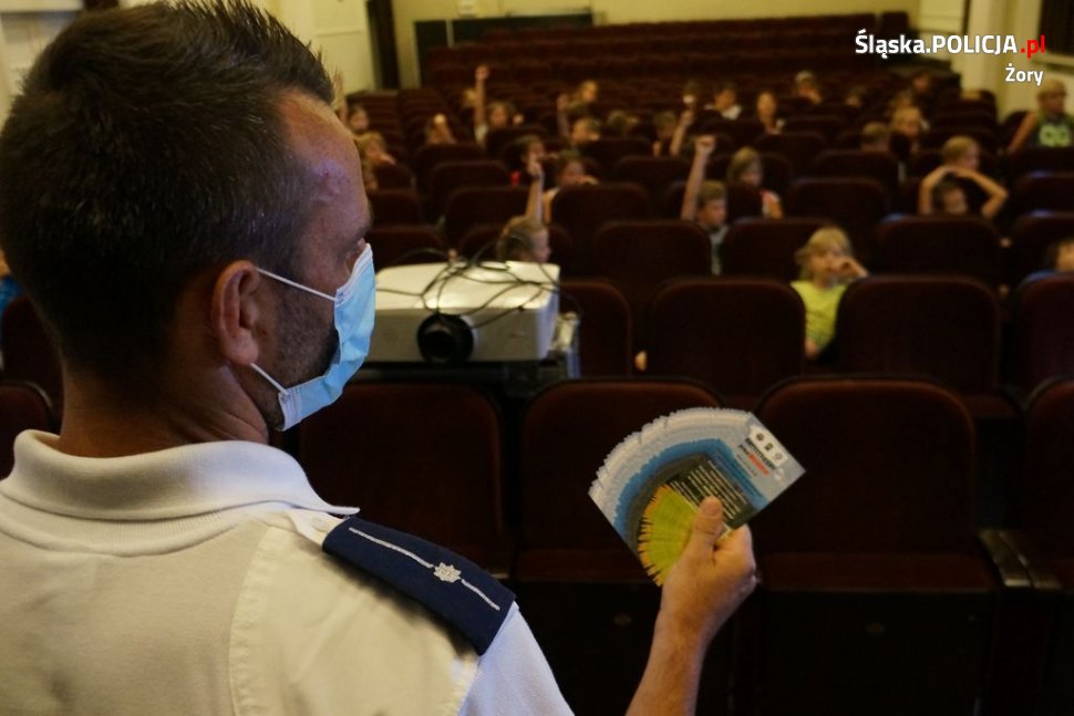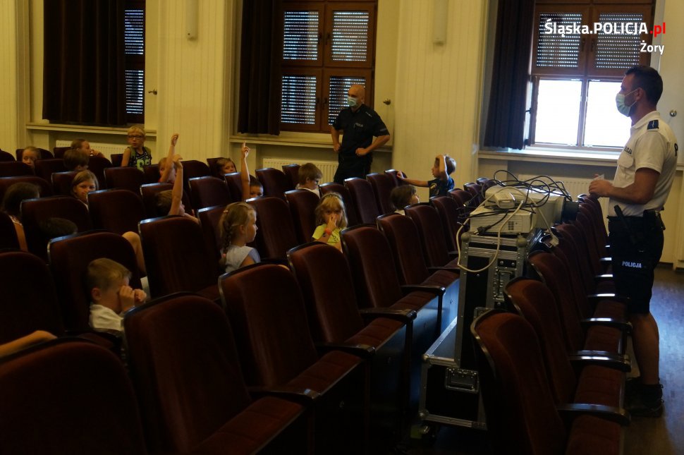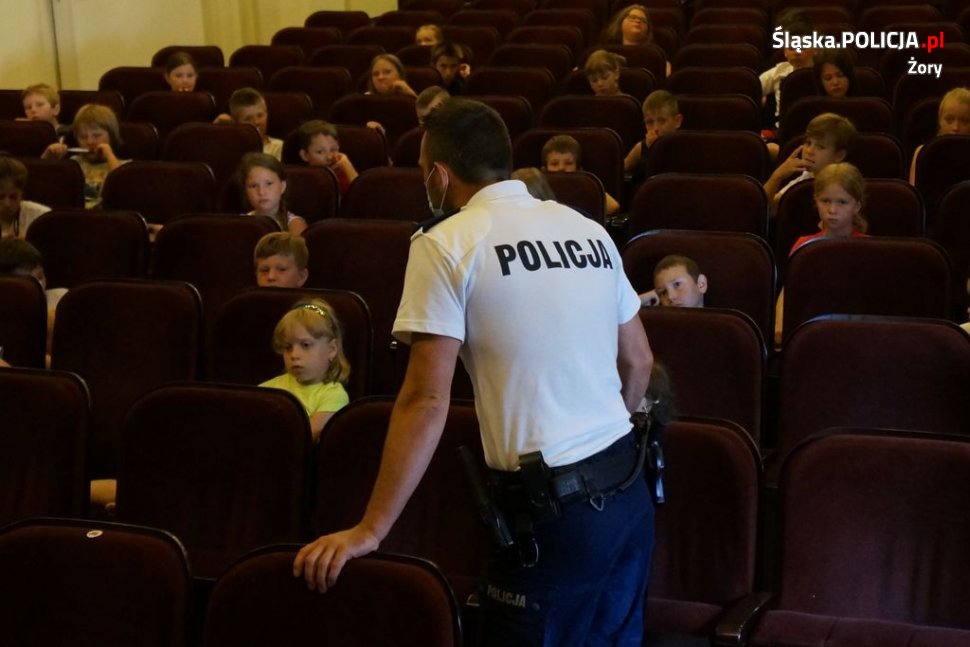 Asp. Krzysztof Nieszporek oraz dzielnicowi – mł.asp. Mariusz Małek i mł.asp. Witold Lisiak z miejscowej komendy odwiedzili dzisiaj półkolonistów w Miejskim Ośrodku Kultury w Żorach. Podczas spotkania rozmawiali z uczestnikami o zasadach bezpiecznych zachowań w wakacje. Zwrócili uwagę na niebezpieczne sytuacje na podwórku, w podróży, nad wodą, czy w górach, ale także ostrzegali przed nieznajomymi i radzili, jak postąpić w przypadku zagrożenia.