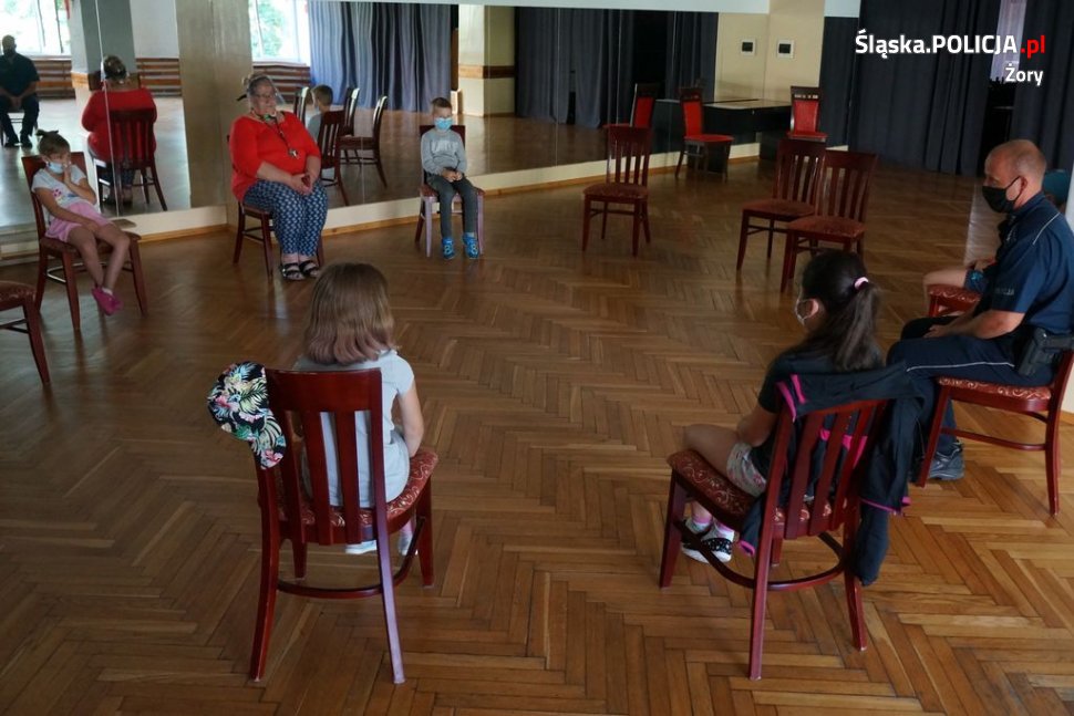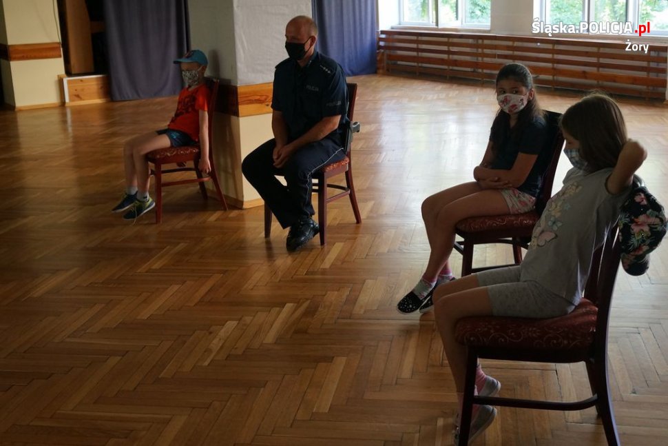 Żorski profilaktyk asp. Krzysztof Nieszporek i dzielnicowy st.asp. Krzysztof Starowicz odwiedzili dzisiaj uczestników spotkania, które w ramach akcji LATO W MIEŚCIE zorganizowano w osiedlowym Klubie Rebus. Z zachowaniem obowiązujących rygorów sanitarnych policjanci przeprowadzili pogadankę z kilkuosobową grupą dzieci. Stróże prawa przypomnieli o zasadach bezpiecznego zachowania się w domu, na podwórku, ale także nad wodą, w podróży, czy w czasie krótkich wyjazdów za miasto.