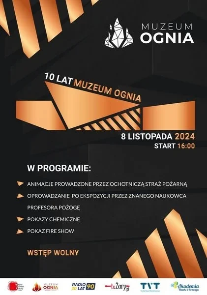 Impreza z okazji 10. urodzin Muzeum Ognia odbędzie się w piątek, 8 listopada o godz. 16:00, oczywiście w Muzeum Ognia przy ul. Katowickiej 3. W programie: zwiedzanie wystawy z profesorem Pożogą, atrakcje i pokazy strażackie, pokazy chemiczne oraz widowiskowy Fire Show! Dodatkowo nie zabraknie słodkości oraz rozmów o przyszłości Muzeum Ognia! Dołączcie do nas i razem uczcijmy tę wyjątkową okazję! Wstęp wolny dla wszystkich gości!