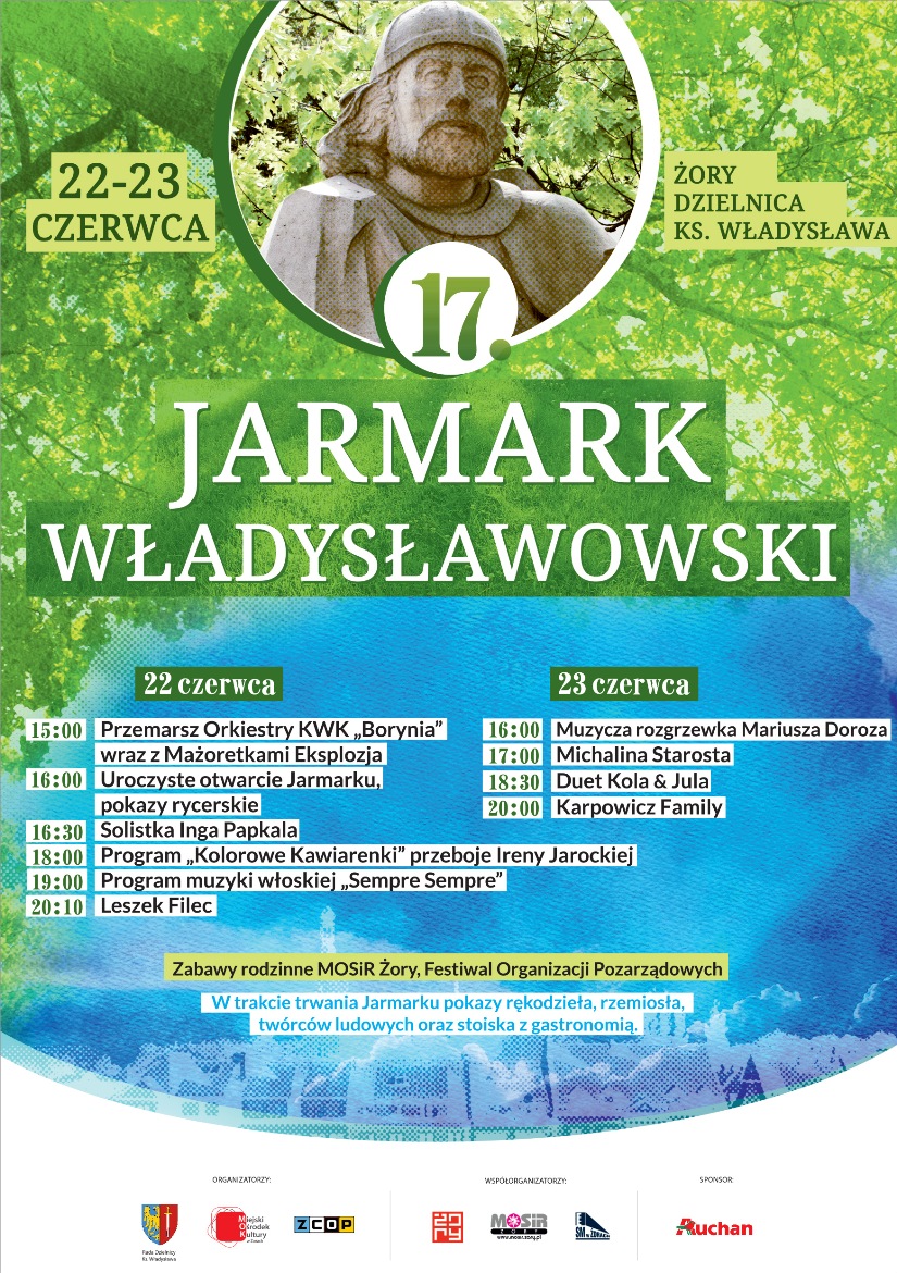 17. Jarmark Władysławowski rozpocznie się w sobotę, 22 czerwca od przemarszu Orkiestry KWK „Borynia” wraz z występami Mażoretek „Eksplozja” z klubu MOK „Wisus”. Uroczyste otwarcie imprezy odbędzie się o godzinie 16:00, a wśród atrakcji znajdą się: pokazy rycerskie, występ solistki Ingi Papkali, program „Kolorowe Kawiarenki” z przebojami Ireny Jarockiej oraz program muzyki włoskiej „Sempre, Sempre”. Gwiazdą wieczoru będzie Leszek Filec, które przeboje podbijają „Listę Śląskich Szlagierów”. Początek koncertu o godz. 20:10.