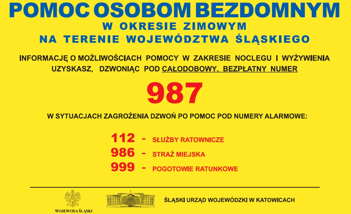 Przypominamy, że co roku od 1 listopada do 31 marca działa specjalna, całodobowa infolinia, obejmująca teren całego województwa śląskiego, gdzie pod numerem telefonu 987 można uzyskać informację o możliwości pomocy dla osób bezdomnych. Informacje na temat pomocy bezdomnym można także znaleźć na stronie internetowej Śląskiego Urzędu Wojewódzkiego.