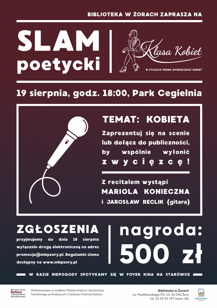 W slamie wezmą udział poetki i poeci z różnych miast śląskich i nie tylko. Decyzję o zwycięstwie podejmie jury złożone z mieszkanek Żor, a zwycięzca otrzyma nagrodę pieniężną w wysokości 500 złotych brutto. Biblioteka przyjmuje zgłoszenia uczestników do dnia 18 sierpnia drogą elektroniczną na adres [email protected]