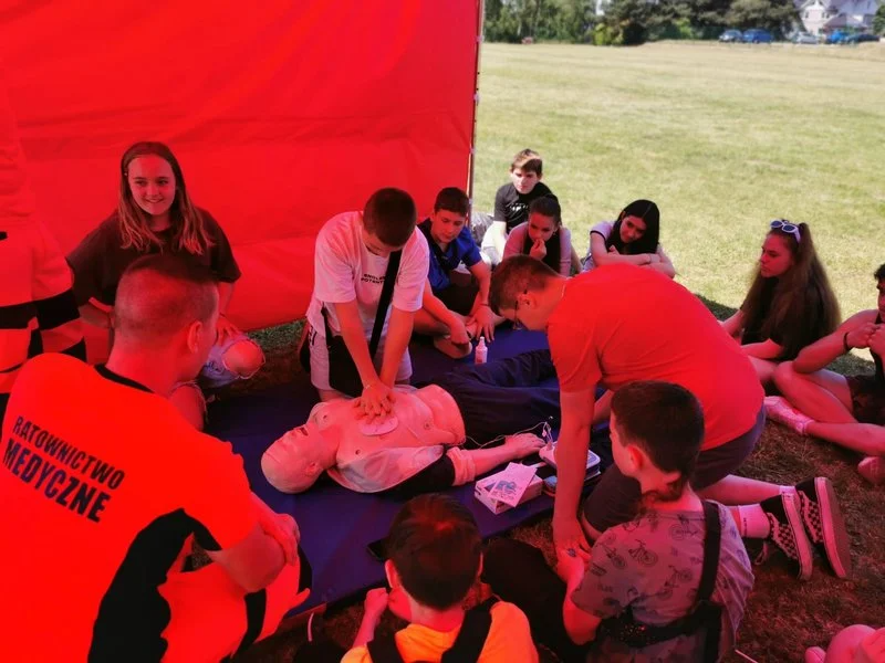 Uczniowie wraz z Wychowawcami na boisku szkolnym odwiedzali stanowiska, które przybliżały im różne dziedziny pierwszej pomocy np. urazy, oparzenia, użądlenia, omdlenia i resuscytacja krążeniowo-oddechowa.