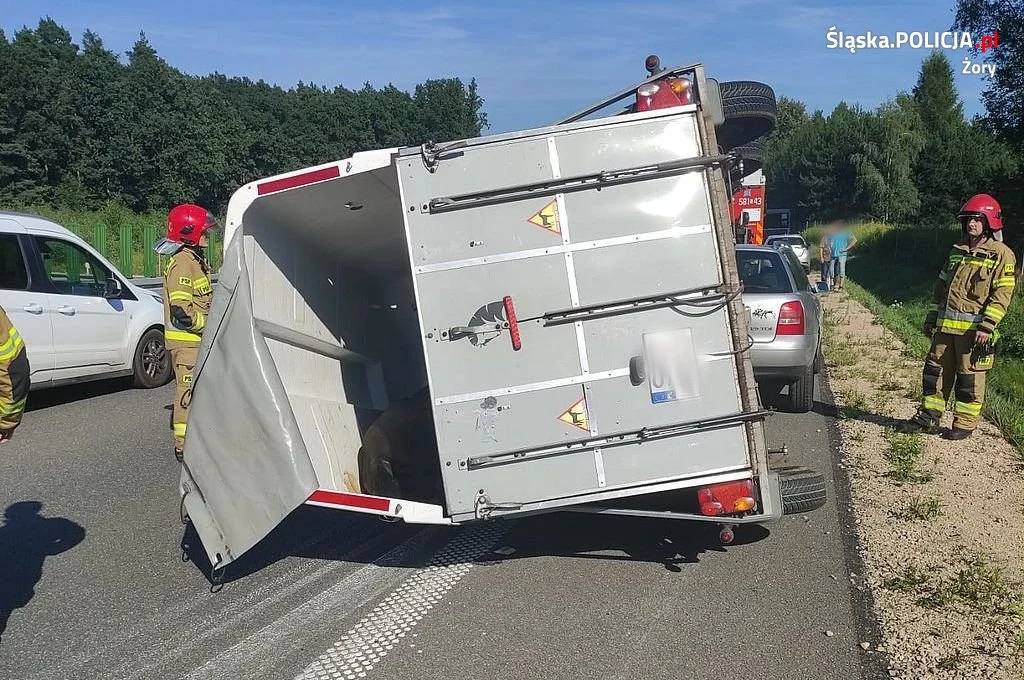 Przybyła na miejsce żorska Policja i strażacy ustalili, iż przewożony koń z nieznanych przyczyn zaczął podskakiwać w przyczepie i doprowadził do jej wywrócenia. Ustalono również, że po przewróceniu się przyczepy koń w niej utknął. Z uwagi na gabaryty zwierzęcia, jego motorykę niezwłocznie dbając o jego bezpieczeństwo – klacz została wyciągnięta z przyczepy, a następnie postawiono przyczepę na koła.