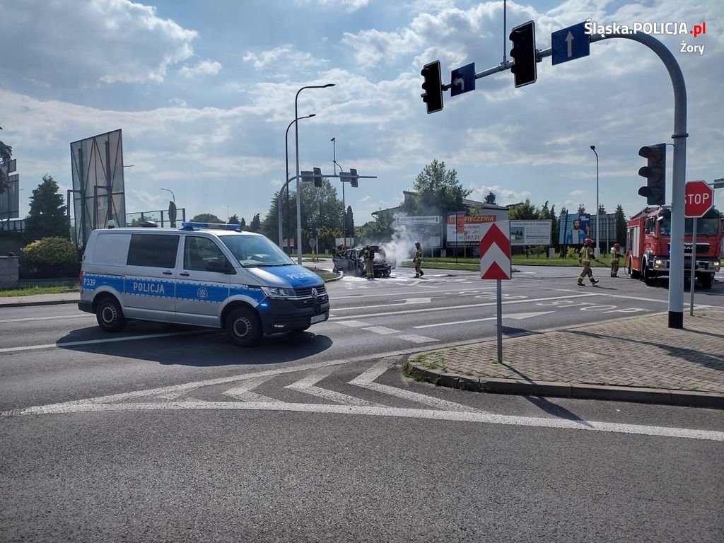 Nietypowa sytuacja na skrzyżowaniu. Samochód stanął w płomieniach!