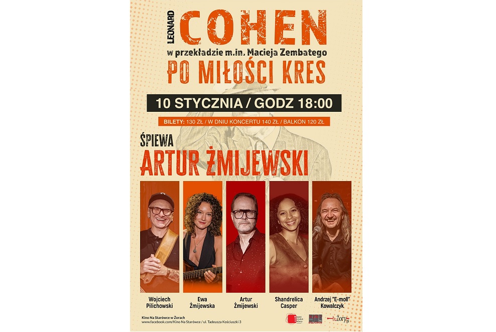 Artur Żmijewski zaśpiewa największe przeboje Leonarda Cohena. Koncert rozpocznie się o 18:00 w Kinie Na Starówce. Bilety: 120 zł / 140 zł.