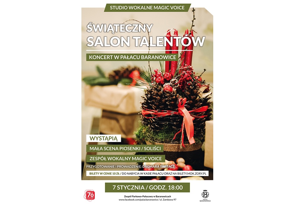 O godz. 18:00 w Pałacu Baranowice odbędzie się wyjątkowy koncert w wykonaniu Studio Wokalnego Magic Voice, Małej Sceny Piosenki oraz solistów. Bilety w cenie 10 zł.
