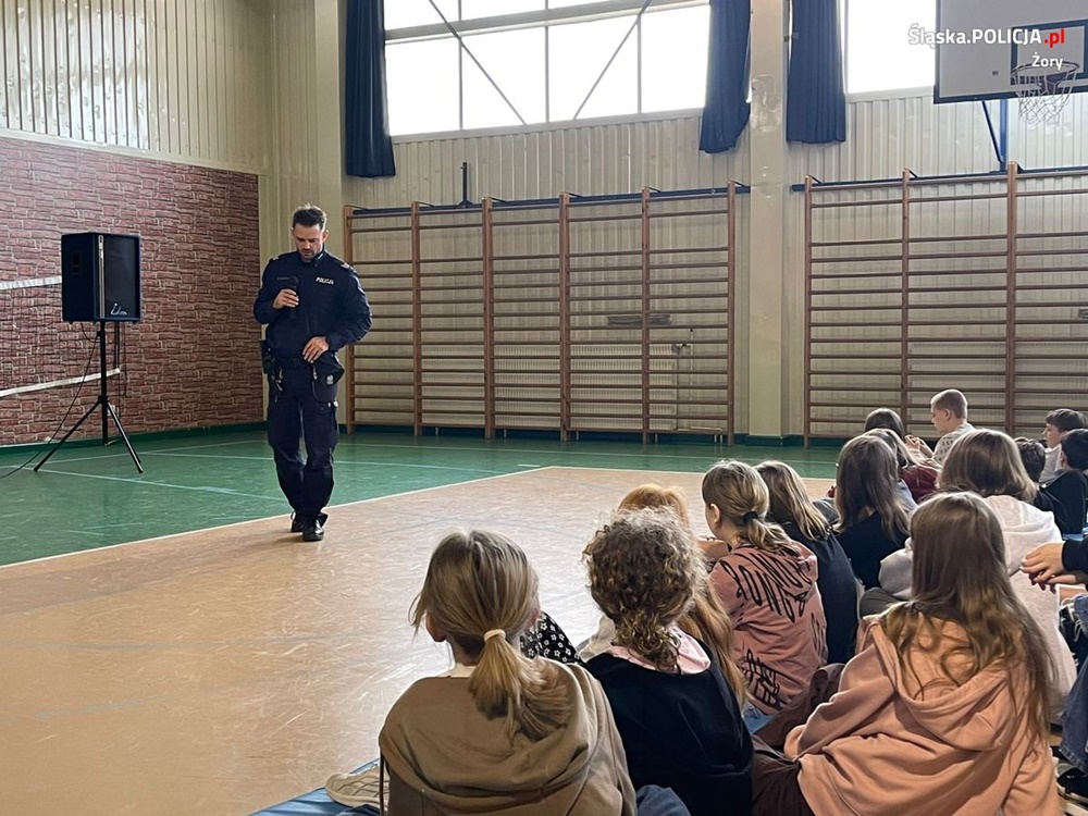 Profilaktyk żorskiej komendy Policji – aspirant Witold Lisiak oraz dzielnicowy Rejonu nr 2 – sierżant sztabowy Konrad Kucharski odwiedzili uczniów Szkoły Podstawowej nr 11 imienia Gustawa Morcinka, aby przypomnieć o obowiązujących młodzież przepisach prawa i wpływie ich zachowania na bezpieczeństwo.