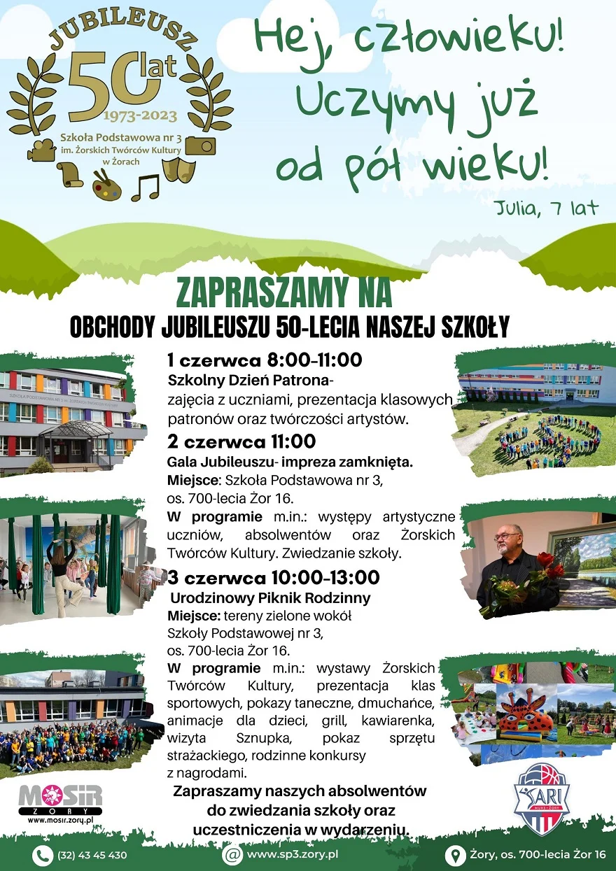 Z okazji obchodzonego wkrótce 50-lecia Szkoła Podstawowa nr 3 w Żorach z Oddziałami Dwujęzycznymi i Sportowymi im. Żorskich Twórców Kultury przygotowała mnóstwo atrakcji. W dniach od 1 do 3 czerwca w szkole odbędą się specjalnie przygotowane wydarzenia.
