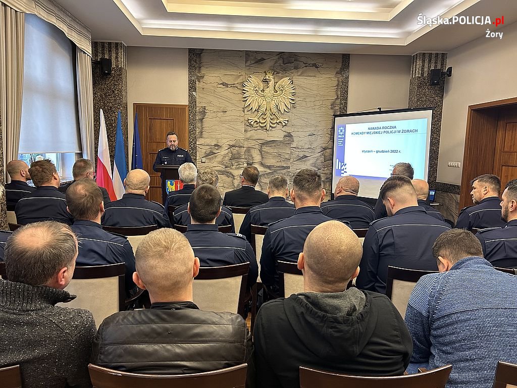 Po przybyciu I Zastępcy Komendanta Wojewódzkiego Policji w Katowicach insp. Mariusza Krzystyniaka i złożeniu meldunku Komendant Miejski Policji w Żorach insp. Mariusz Klepek przywitał wszystkich, a następnie omówił szczegółowo wyniki osiągnięte przez pion ruchu drogowego, prewencji, kryminalnego i zajmujący się zwalczaniem przestępczości gospodarczej w minionym, 2022 roku.