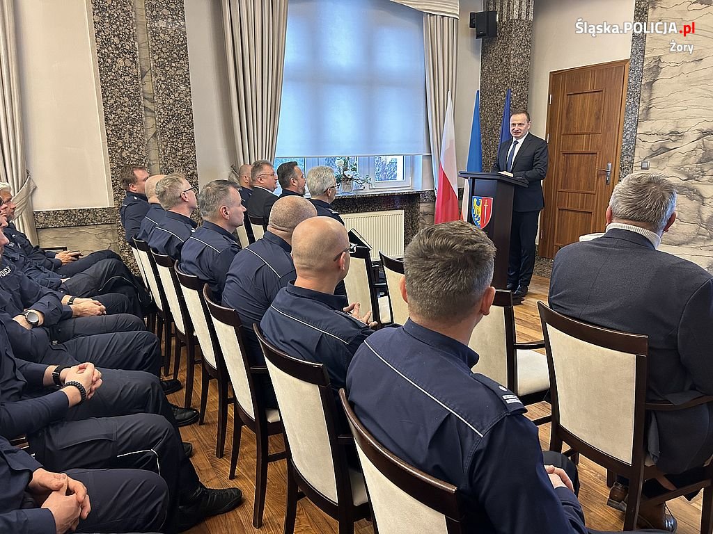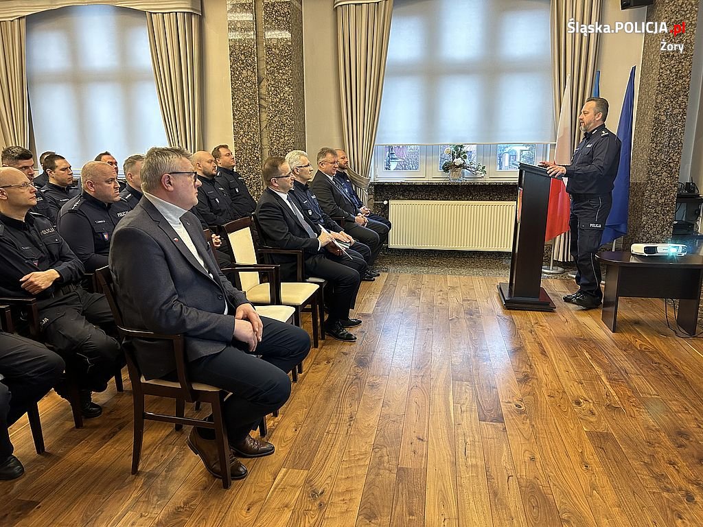 Za pracę policjantom z Żor podziękował także Prezydent Miasta Żory – Waldemar Socha oraz Kazimierz Dajka reprezentujący Radę Miasta. Podkreślili, że praca miejscowych policjantów jest wysoko oceniana nie tylko przez żorskie władze, ale i mieszkańców. Prezydent złożył na ręce I Zastępcy Komendanta Miejskiego Policji w Żorach – nadkom. Tomasza Walkowskiego list gratulacyjny stanowiący podziękowanie za jego wieloletnią służbę i zaangażowanie na rzecz bezpieczeństwa w mieście. Nadkomisarz Tomasz Walkowski przepracował ponad 31 lat w mundurze, przez cały czas służąc w żorskiej jednostce Policji, a w najbliższym czasie zaplanował przejście na zasłużoną emeryturę.
