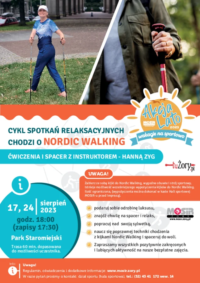 Miejski Ośrodek Sportu i Rekreacji w Żorach zaprasza na cykl spotkań relaksacyjnych Nordic Walking. Osoby chętne 17 i 24 sierpnia br. będą mogły poćwiczyć i pospacerować z instruktorem – Hanną Zyg.
