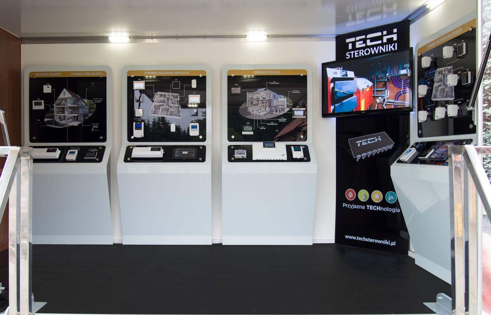 Wnętrze mobilnego showroomu wypełniają najpopularniejsze modele sterowników do różnych typów ogrzewania: podłogowego (w tym najnowsze systemy serii 9 i 10), grzejnikowego, kominków czy wykorzystujących energią odnawialną. Urządzenia zamontowane są na specjalnie przygotowanych ekspozytorach, wzbogacone o konkretne opisy oraz wizualizacje. Wszystkie oferowane modele urządzeń to produkty polskie: polscy pracowni przygotowują projekty, oprogramowanie oraz poszczególne elementy urządzeń, składają je w całość oraz testują. Każdy chętny może przyjść i sprawdzić urządzenia, porozmawiać z przedstawicielami firmy na temat potrzeb własnej instalacji grzewczej, a także otrzymać dodatkowe materiały reklamowe, które pomogą w doborze urządzeń do efektywnego i oszczędnego zarządzania ogrzewaniem.