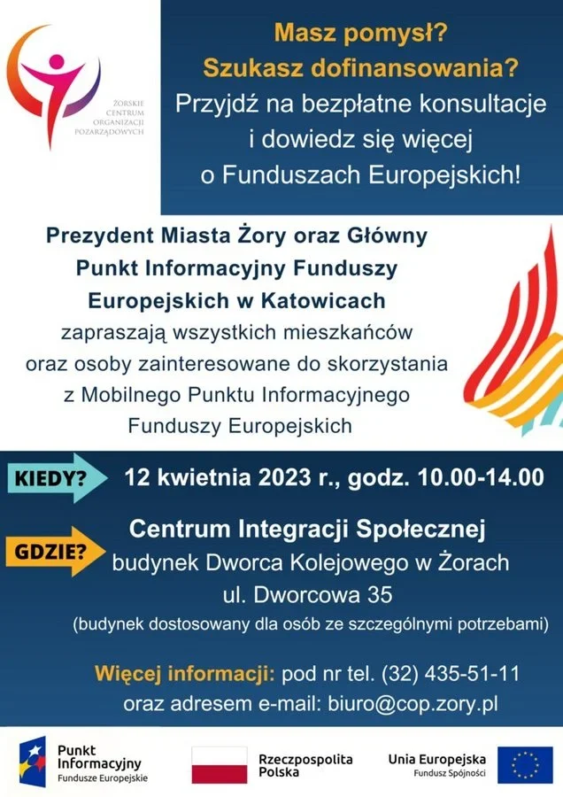 Prezydent Miasta Żory oraz Główny Punkt Informacyjny Funduszy Europejskich w Katowicach zapraszają 12 kwietnia br. do skorzystania z Mobilnego Punktu Informacyjnego w naszym mieście.