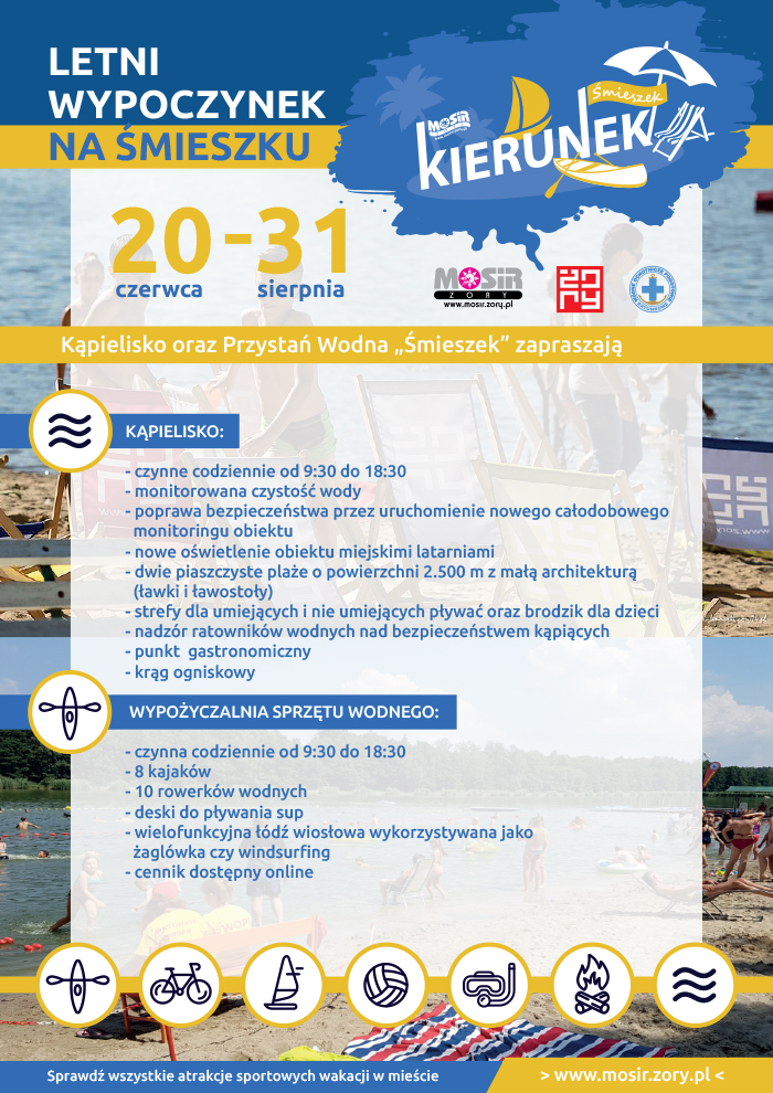 MOSIR Żory ponownie zaprasza mieszkańców do skorzystania z oferty kąpieliska i wypożyczalni przy stawie Śmieszek. Otwarcie już 20 czerwca w pierwszy dzień wakacji.