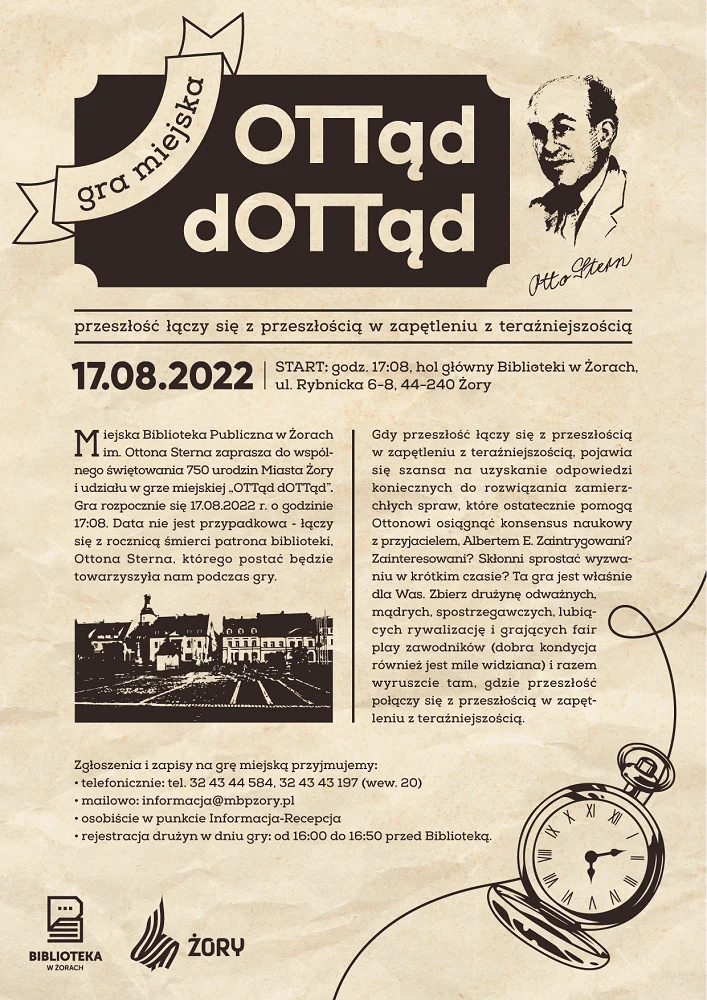 Miejska Biblioteka Publiczna w Żorach zaprasza do wspólnego świętowania 750. urodzin Miasta Żory i udziału w grze miejskiej „OTTąd dOTTąd”. Start: 17 sierpnia o godzinie 17:08 w holu głównym biblioteki.