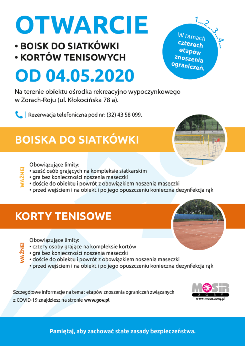 Aby móc zagrać w siatkówkę lub tenisa, wystarczy zarezerwować wybrany obiekt sportowy dzwoniąc pod numer 32/43 58 099. Na kompleksie siatkarskim obowiązuje limit sześciu osób, a z kompleksu tenisowego mogą korzystać jednocześnie cztery osoby. Przed wejściem na obiekt i po jego opuszczeniu koniecznie zdezynfekujcie ręce. W trakcie gry nie trzeba nosić maseczki, pamiętajmy jednak o zachowaniu obowiązujących zasad bezpieczeństwa.