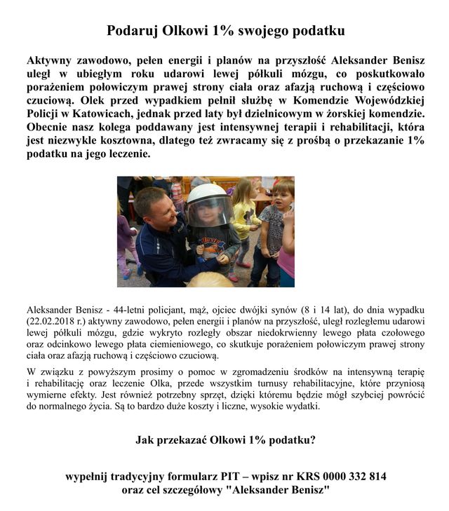 Na jeden z numerów policyjnych zadzwoniła mieszkanka Żor, która poprosiła o pomoc w przekazaniu 1% na leczenie policjanta pełniącego niegdyś służbę w charakterze dzielnicowego w naszym mieście.