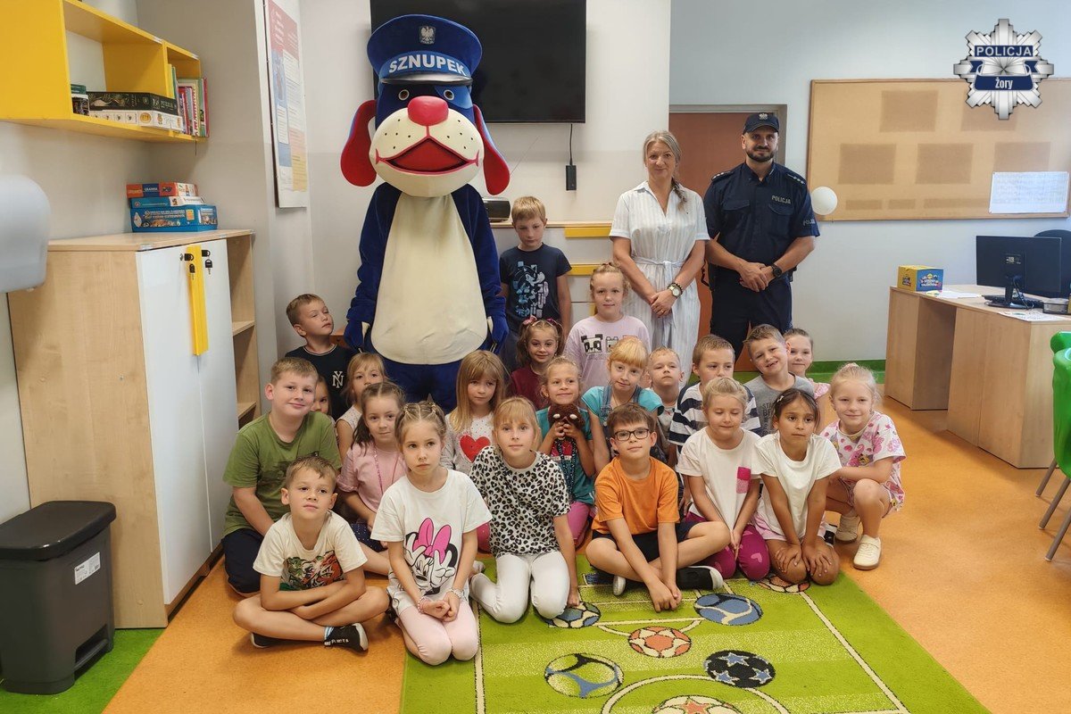 Policjant z Żor przypomniał pierwszoklasistom zasady bezpiecznej drogi do szkoły. Spotkanie edukacyjne z udziałem policyjnej maskotki Sznupka zwiększyło świadomość dzieci.
