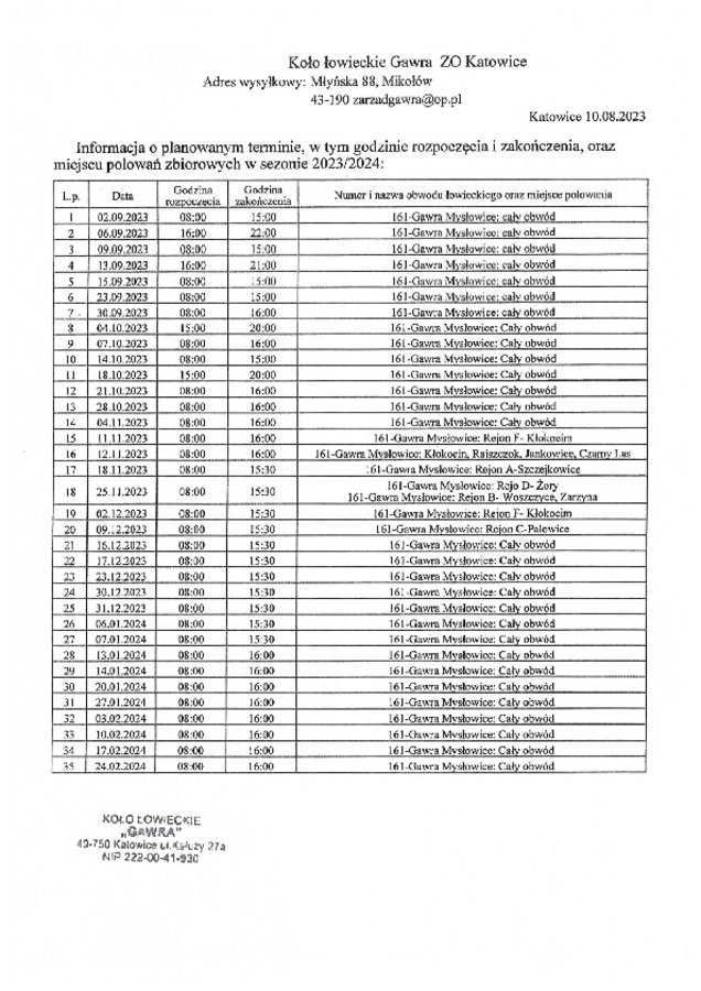 Zgodnie z art. 42ab ust. 2 ustawy z dnia 13 października 1995 r. Prawo Łowieckie (t.j. Dz. U. z 2023 r. poz. 1082) Prezydent Miasta Żory podaje do publicznej wiadomości informację o terminach rozpoczęcia i zakończenia oraz o miejscach przeprowadzania polowań zbiorowych, organizowanych przez Koła Łowieckie „Ostoja” Gliwice oraz „Gawra” na sezon 2023/2024.