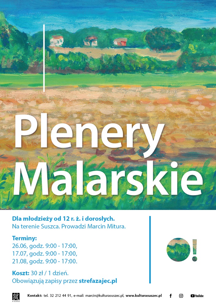 Zapraszamy wszystkich na plenery malarskie. Łącznie odbędą się trzy plenery całodniowe. Po jednym spotkaniu w czerwcu, lipcu i sierpniu. Spotkanie rozpocznie się na zielonej przestrzeni wokół Gminnego Ośrodka Kultury w Suszcu.