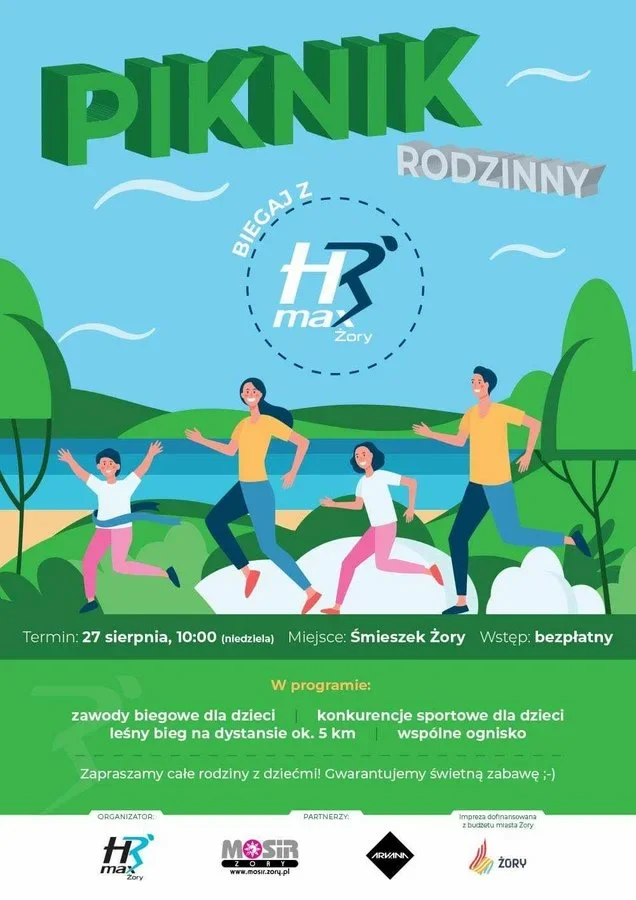 Piknik rodzinny „Biegaj z HRmaxem” rozpocznie się 27 sierpnia o godz. 10:00 na terenie kąpieliska „Śmieszek”. Wstęp wolny! Wydarzenie będzie doskonałą okazją dla całych rodzin, by wziąć udział w konkurencjach sprawnościowych i biegowych, a po dawce dobrej zabawy wspólnie spocząć i zjeść coś smacznego. Żorski klub biegowy HRmax zaplanował zawody biegowe i konkurencje sportowe dla najmłodszych, a dla dorosłych uczestników leśny bieg na dystansie 5 km. W programie także wspólne ognisko – kiełbaski, pieczywo i dobra zabawa gwarantowane!