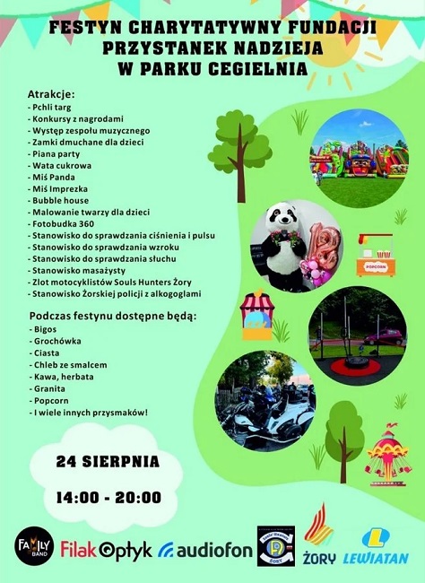 Festyn Charytatywny Fundacji Przystanek Nadzieja odbędzie się w sobotę, 24 sierpnia w Parku Cegielnia w godzinach 14:00 – 20:00. Podczas wydarzenia prowadzona będzie zbiórka publiczna, z której dochód będzie w całości przeznaczony na paczki świąteczne dla ubogich rodzin.