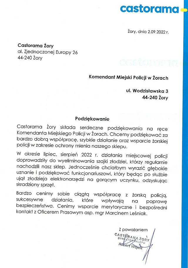 Podziękowania za współpracę i działania żorskich stróżów prawa na rzecz przeciwdziałania kradzieżom wpłynęły na ręce Komendanta Miejskiego Policji w Żorach. Dyrektor jednego z sieci centrów budowlanych wyraził słowa uznania za zaangażowanie i sukcesywne działanie mundurowych na rzecz poprawy bezpieczeństwa. Autor listu zwrócił uwagę, iż działania żorskiej Policji doprowadziły do wyeliminowania szajki złodziei, którzy na przełomie miesięcy wakacyjnych okradali sklep. Jednocześnie dyrektor wyraził uznanie za postawę żorskiego policjanta, który w tym roku, w czasie wolnym od służby zatrzymał na gorącym uczynku złodzieja elektronarzędzi.