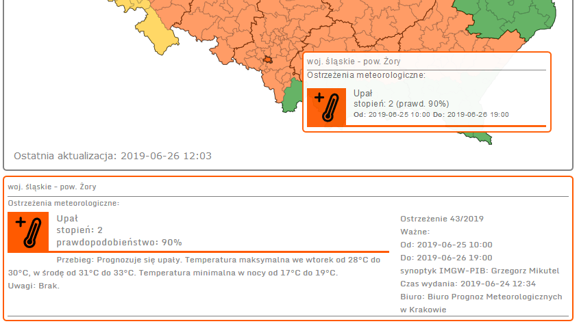 Biuro Prognoz Meteorologicznych ostrzega także przed upałami na obszarze Żorach do godz. 19.00 w dniu 26 czerwca. Temperatura maksymalna w środę wyniesie od 31°C do 33°C. Temperatura minimalna w nocy od 17°C do 19°C.