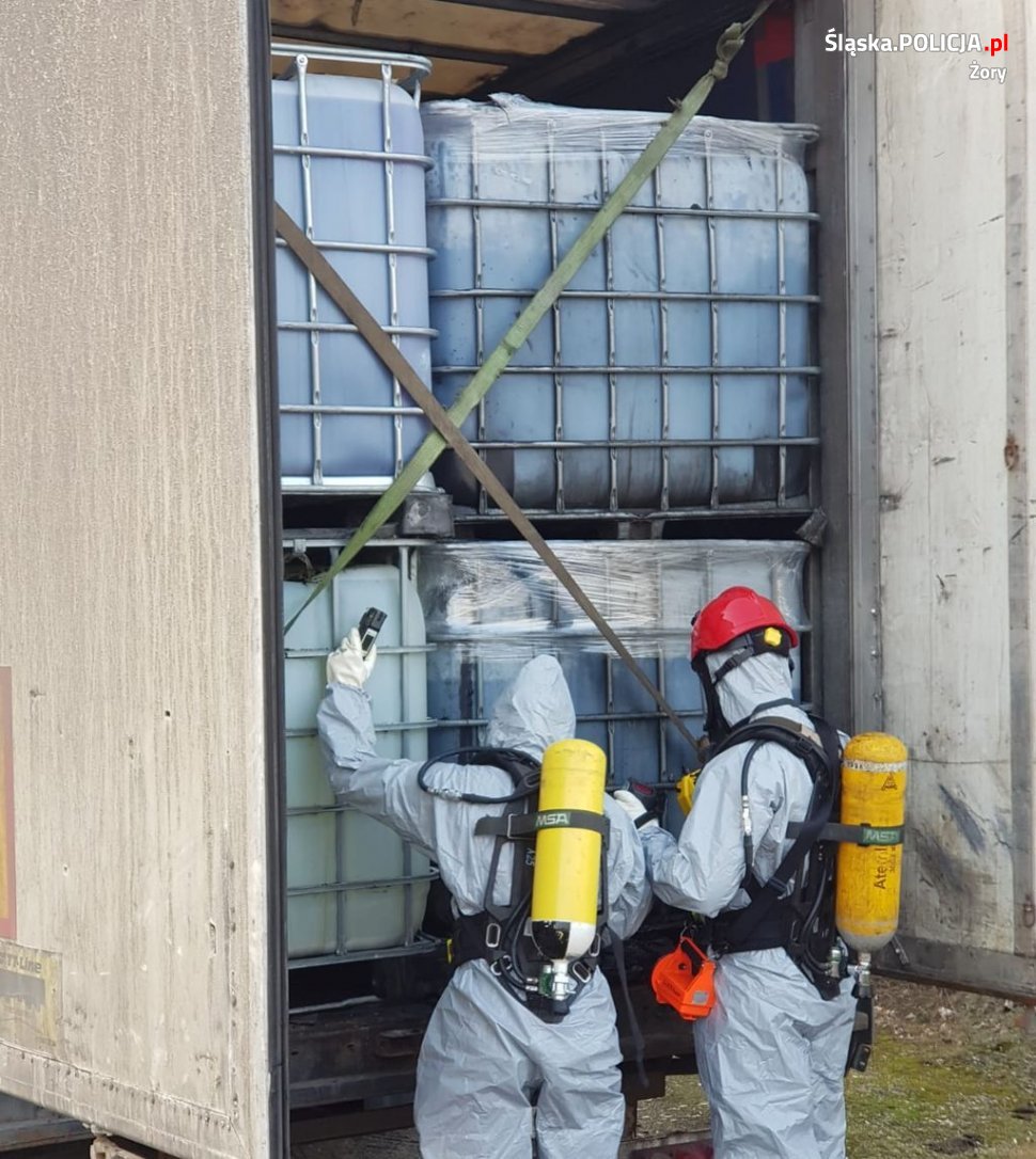 Na jednej z prywatnych posesji na terenie Żor ujawnili pojemniki zawierające płynną substancję o niewiadomym składzie. Zbiorniki o pojemności 1000 litrów każdy były umieszczone na 14 naczepach ciężarowych. W sumie w naczepach znajdowało się około 700 tysięcy litrów substancji – mówił st. asp. Łukasz Chmielecki.