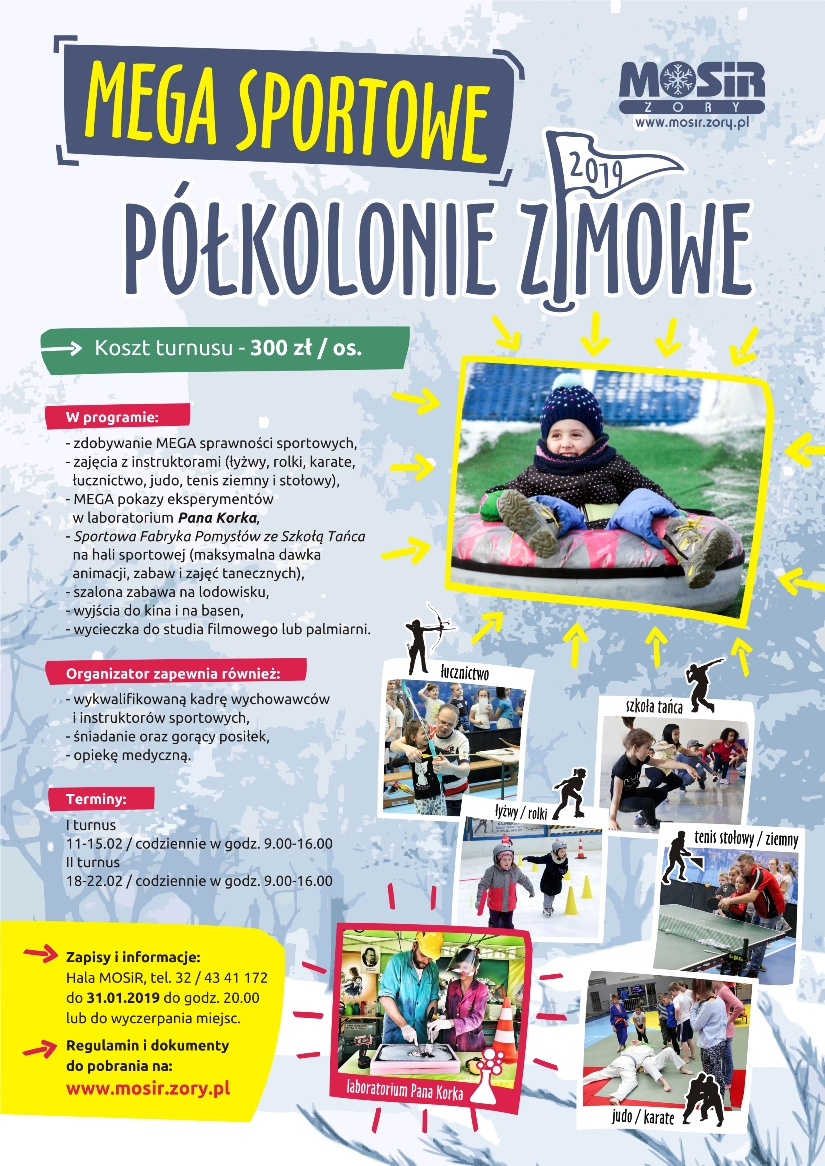 „Mega sportowe półkolonie zimowe” to propozycja Miejskiego Ośrodka Sportu i Rekreacji w Żorach, przygotowana specjalnie na ferie zimowe dla dzieci w wieku 6-13 lat.