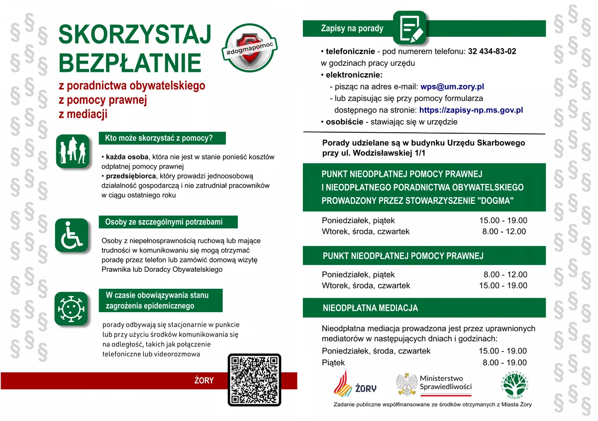 Na terenie miasta Żory funkcjonuje system nieodpłatnej pomocy prawnej, nieodpłatnego poradnictwa obywatelskiego oraz nieodpłatnej mediacji w ramach ogólnopolskiego systemu nieodpłatnej pomocy prawnej, poradnictwa obywatelskiego oraz edukacji prawnej (Ustawa z dnia 5 sierpnia 2015 r. o nieodpłatnej pomocy prawnej, nieodpłatnym poradnictwie obywatelskim oraz edukacji prawnej).