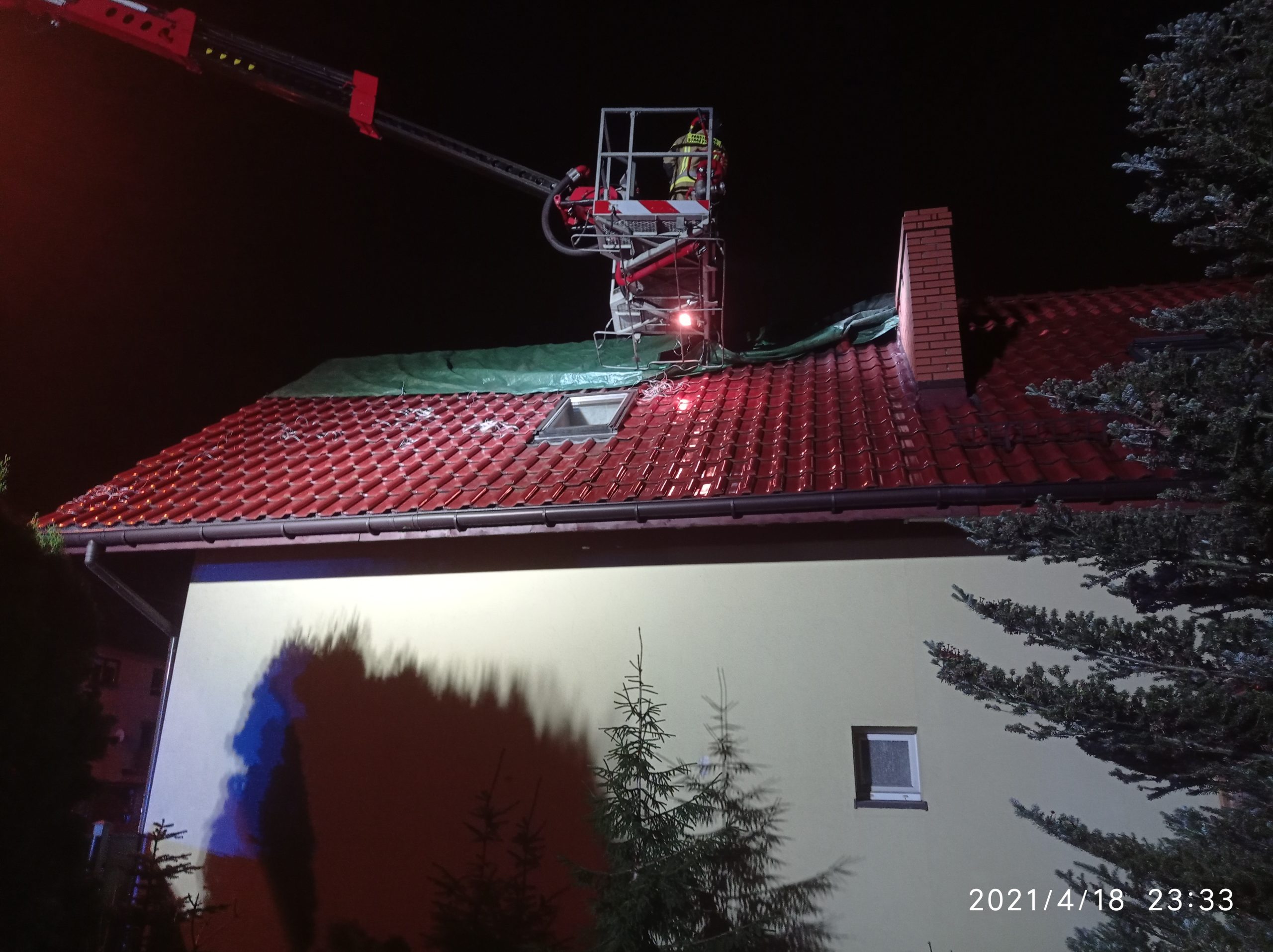 Mieszkańcy się ewakuowali. Strażacy ugasili pożar podając prądy wody z zewnątrz i od wewnątrz budynku. Po ugaszeniu zabezpieczyli uszkodzone pokrycie dachu plandeką. Prawdopodobną przyczyną pożaru było zapalenie się krokwi dachowej od przewodu kominowego. Na miejsce przybył Mistrz Kominiarski oraz Inspektor Nadzoru Budowlanego. Działania ratownicze zakończyły się kilka minut po północy.