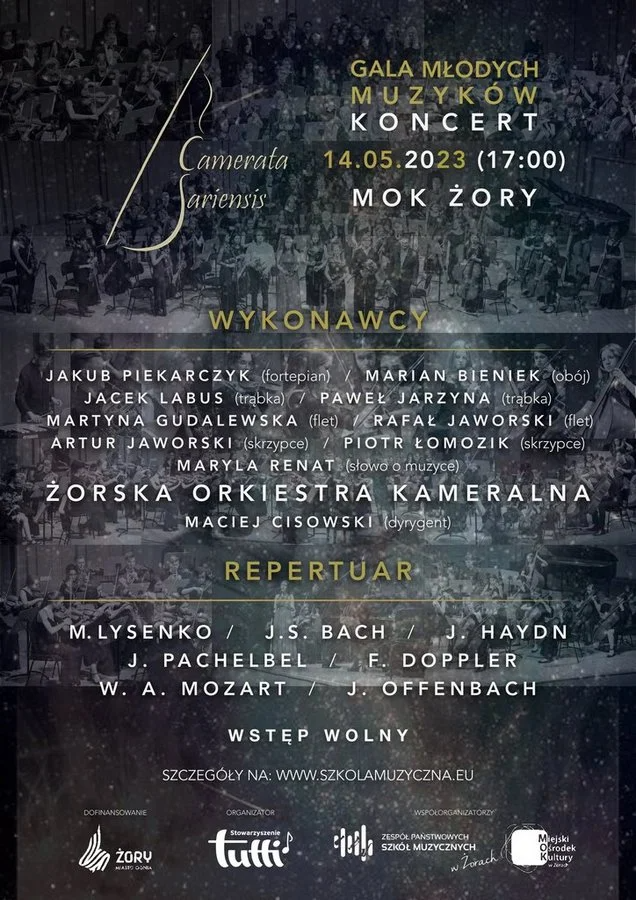 Już 14 maja br. w sali teatralnej Miejskiego Ośrodka Kultury w Żorach odbędzie się koncert symfoniczny pt. Gala Młodych Muzyków. W koncercie wezmą udział uczniowie, absolwenci szkoły muzycznej oraz Żorska Orkiestra Kameralna “Camerata Sariensis” pod dyr. Macieja Cisowskiego.
