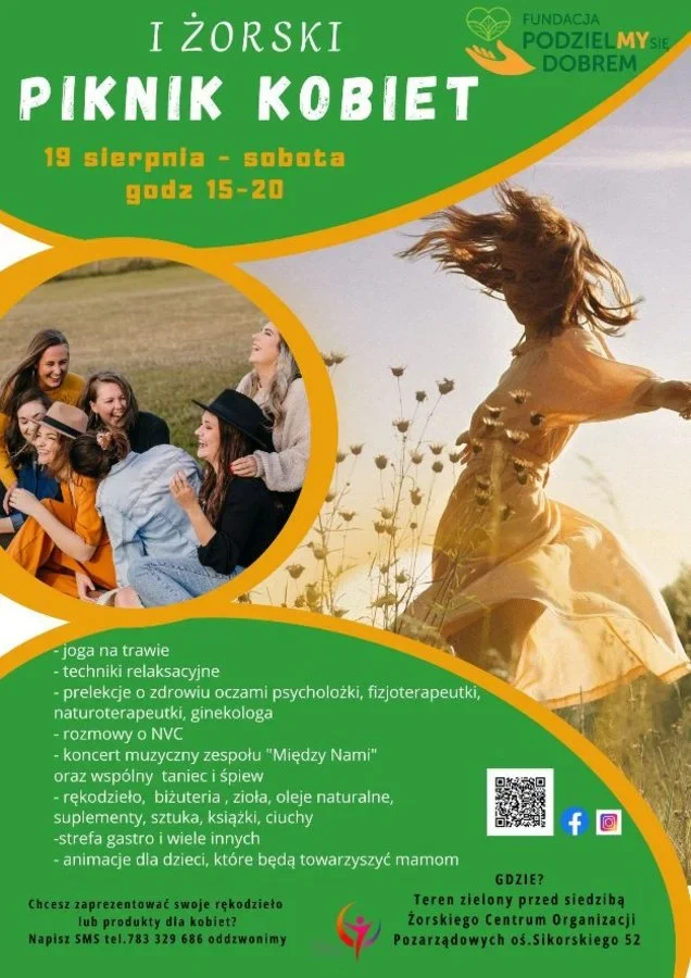 Fundacja Podzielmy się Dobrem wraz z Żorskim Centrum Organizacji Pozarządowych zaprasza wszystkie Panie na I Żorski Piknik Kobiet. Wydarzenie odbędzie się w sobotę, 19 sierpnia br. na zielonym terenie przed budynkiem Żorskiego Centrum Organizacji Pozarządowych przy oś. Sikorskiego 52.