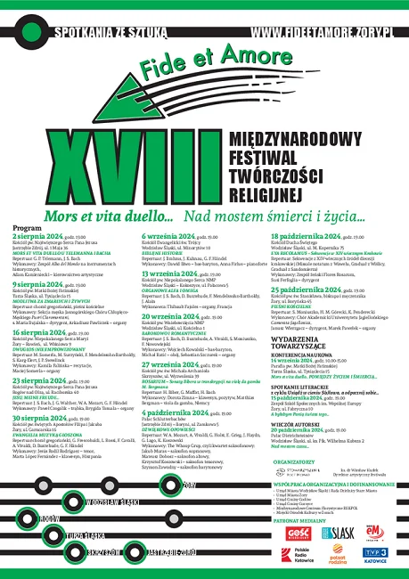XVIII edycja Międzynarodowego Festiwalu Twórczości Religijnej Fide et Amore, w roku 2024 odbywająca się pod hasłem Mors et vita duello… i z podtytułem „Nad mostem śmierci i życia…”, rusza pełną parą w piątek 2 sierpnia o godz. 19.00 w kościele pw. Najświętszego Serca Pana Jezusa w Jastrzębiu Zdroju. Tydzień później (9 sierpnia) odbędzie się liturgiczna inauguracja w sanktuarium Matki Bożej Fatimskiej w Turzy Śląskiej. Festiwal potrwa aż do 25 października i będzie obejmował 12 artystycznych piątków oraz trzy wydarzenia dodatkowe (dwa literackie oraz konferencję naukową).